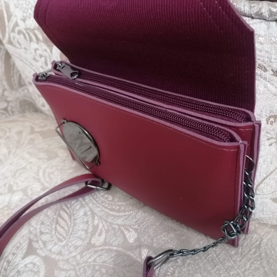The Multi Zipper Clutch Purse in maroon offers organized storage with multiple zippered compartments, keeping essentials secure and easily accessible. Its compact design suits both casual and formal occasions, while the rich maroon hue adds a touch of sophistication and versatility to any outfit. Crafted for durability and convenience, this clutch is ideal for those seeking practical elegance in a purse.
