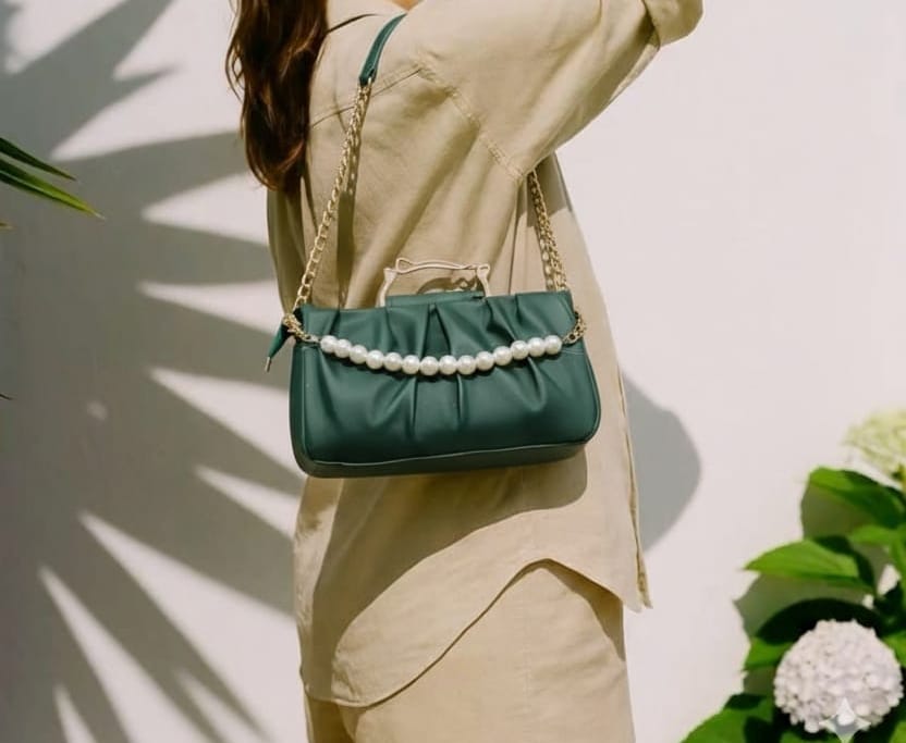 Elevate your daughter's accessory collection with this sophisticated green handbag, expertly designed for the modern young woman. The striking pearl-embellished front panel adds refined elegance and visual interest, while the rich green hue complements virtually any outfit. Crafted with attention to detail, this versatile piece transitions seamlessly from school to social occasions. The structured silhouette provides practical storage without compromising on style, making it an essential addition to any fashion-forward wardrobe.